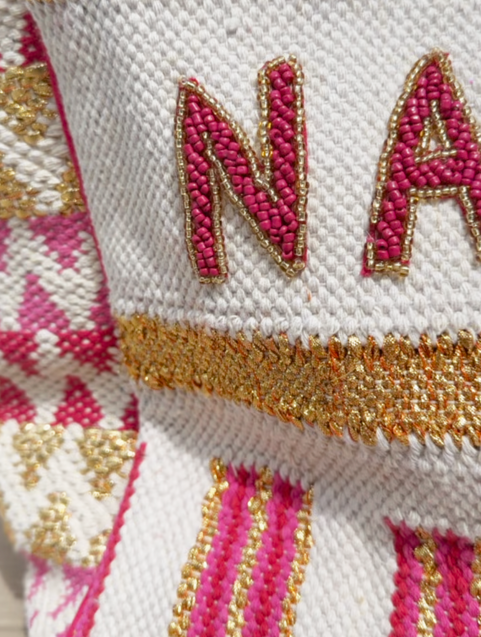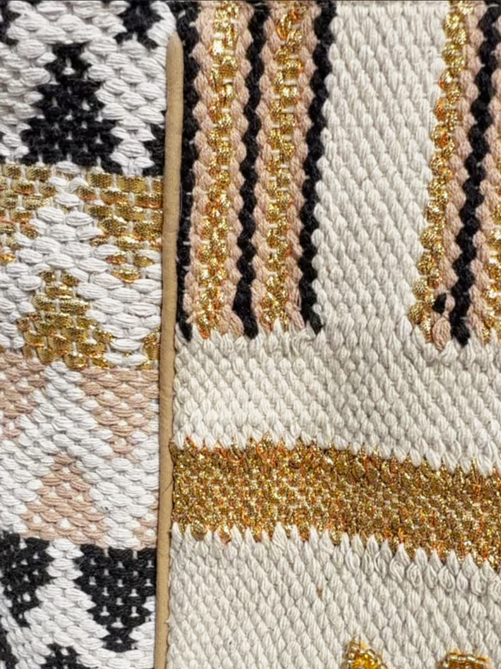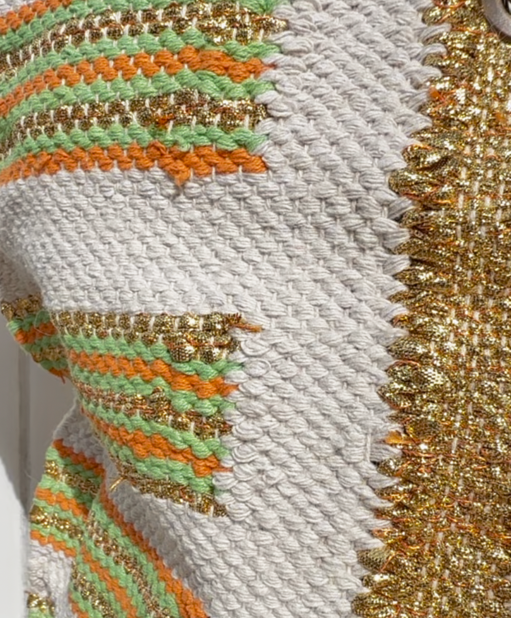 Created exclusively for The League Club. Designed by Amanda Jaron and handwoven by master artisans, each piece blends gold and cotton fibers with delicate hand beading and metallic accents.